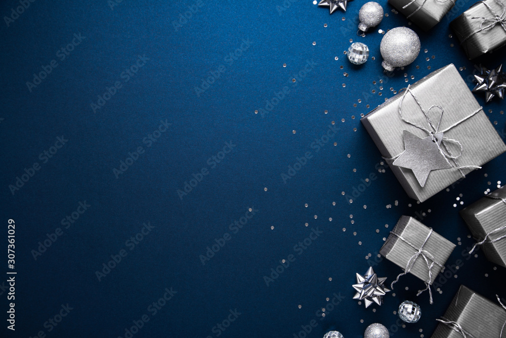 Merry Christmas and Happy Holidays greeting card, frame, banner. New Year. Noel. Silver Christmas gifts, ornaments on blue background top view. Winter holiday xmas theme. Flat lay.