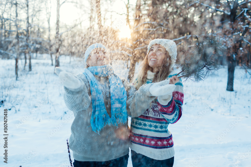 Winter fun activities. Mother and adult daughter throwing snow outdoors. Family relaxing in forest for holidays
