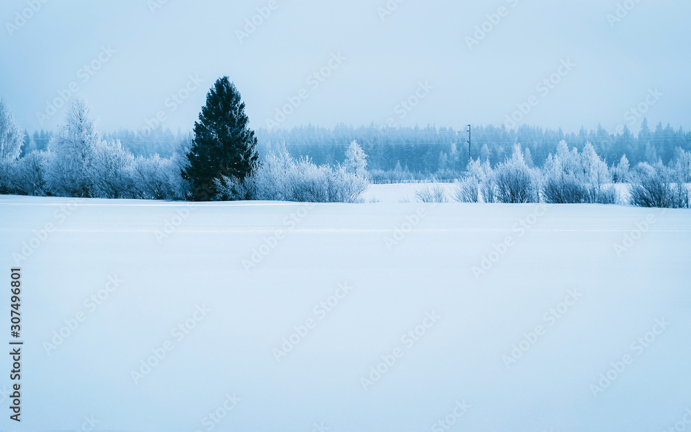 Winter road with snow in Finland. Landscape of Lapland in Europe. Forest along highway during ride. Snowy trip. Cold driveway. Driving in Finnish motorway on north Rovaniemi village. View with tree