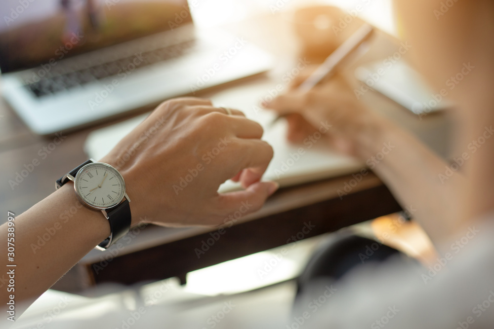 looking at luxury watch on hand check the time writing business information in notepad at workplace.concept for managing time organization working,punctuality,appointment.fashionable wearing stylish