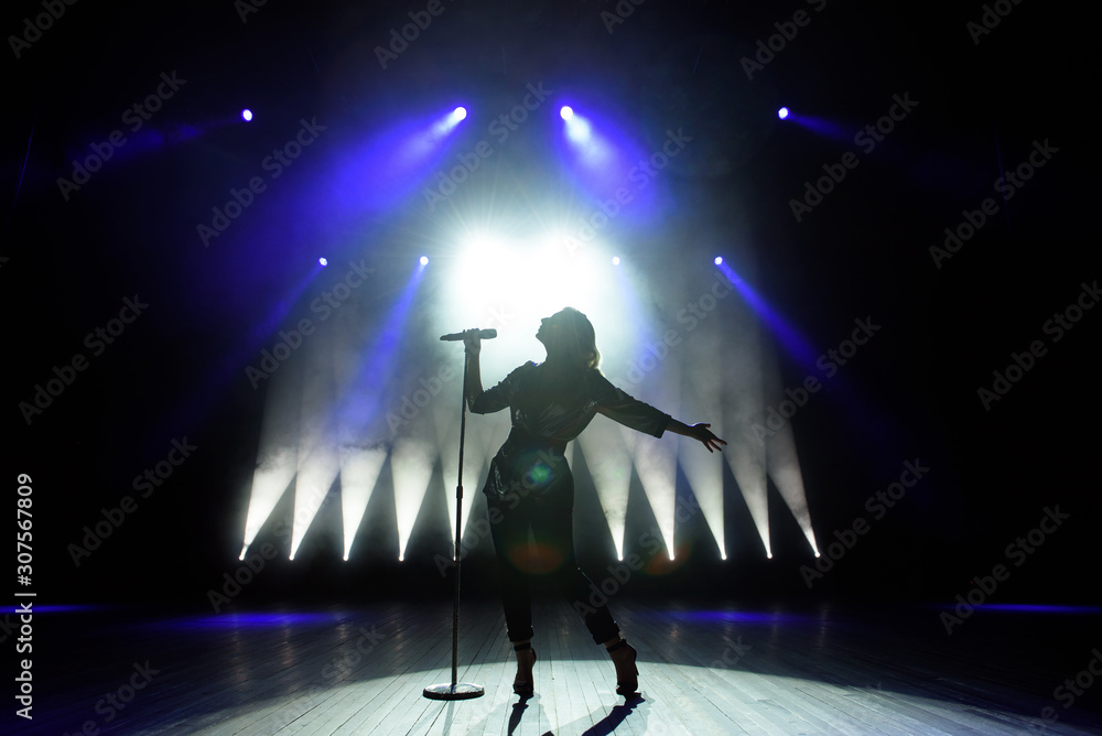 Silhouette of singer on stage. Dark background, smoke, spotlights.