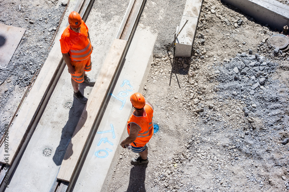 zwei Bauarbeiter auf einer Baustelle, Tiefbauarbeiten an den Schienen einer Strassenbahn, Bern, Schweiz