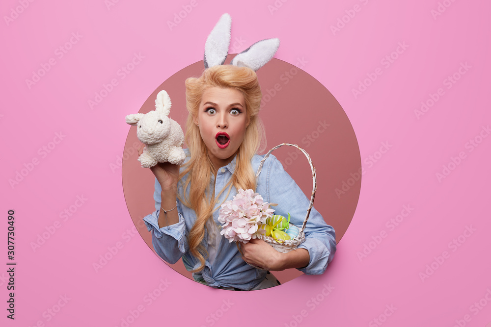 Happy Easter. Young woman with bunny ears and basket full of Easter eggs on pink background. crawls out through a round hole in the wall. Pin up and retro style fashion.