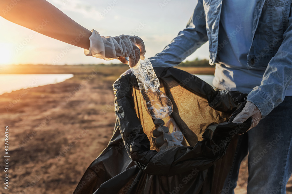 people volunteer keeping garbage plastic bottle into black bag at park near river in sunset
