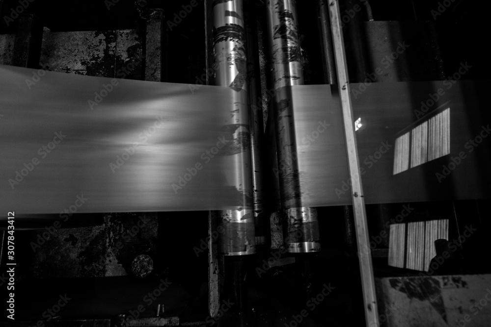 Black & White imagery of spool of plastic packaging sheet heavy duty for industrial use outdoors. wrapped around a metal pole ready to feed into a machine for cutting into shape or printing logos.
