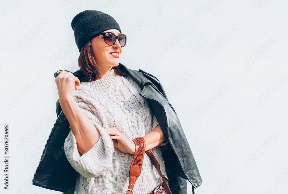 Smiling female dressed fashion style warm knitted sweater with black leather biker jacket and Beanie Hat with flap bag trendy sunglasses posing on the white wall background.