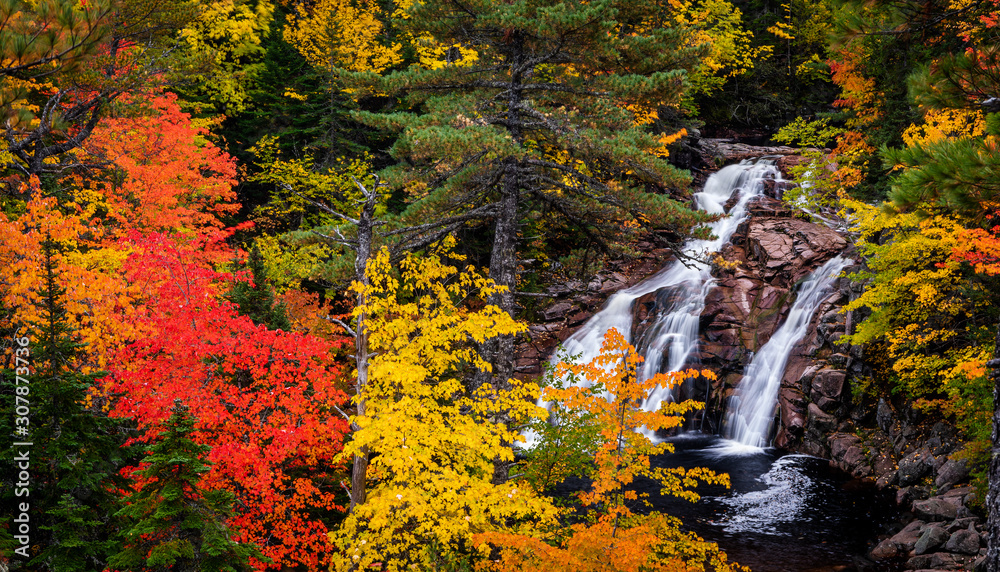 Colourful autumn leaves fram Mary Ann Falls in Cape Breton, Nova Scotia, Canada