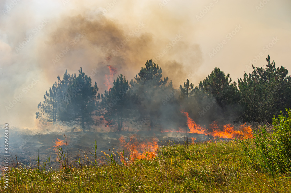 Fire in the Dnieper River floodplains, smoke pollutes the atmosphere.
