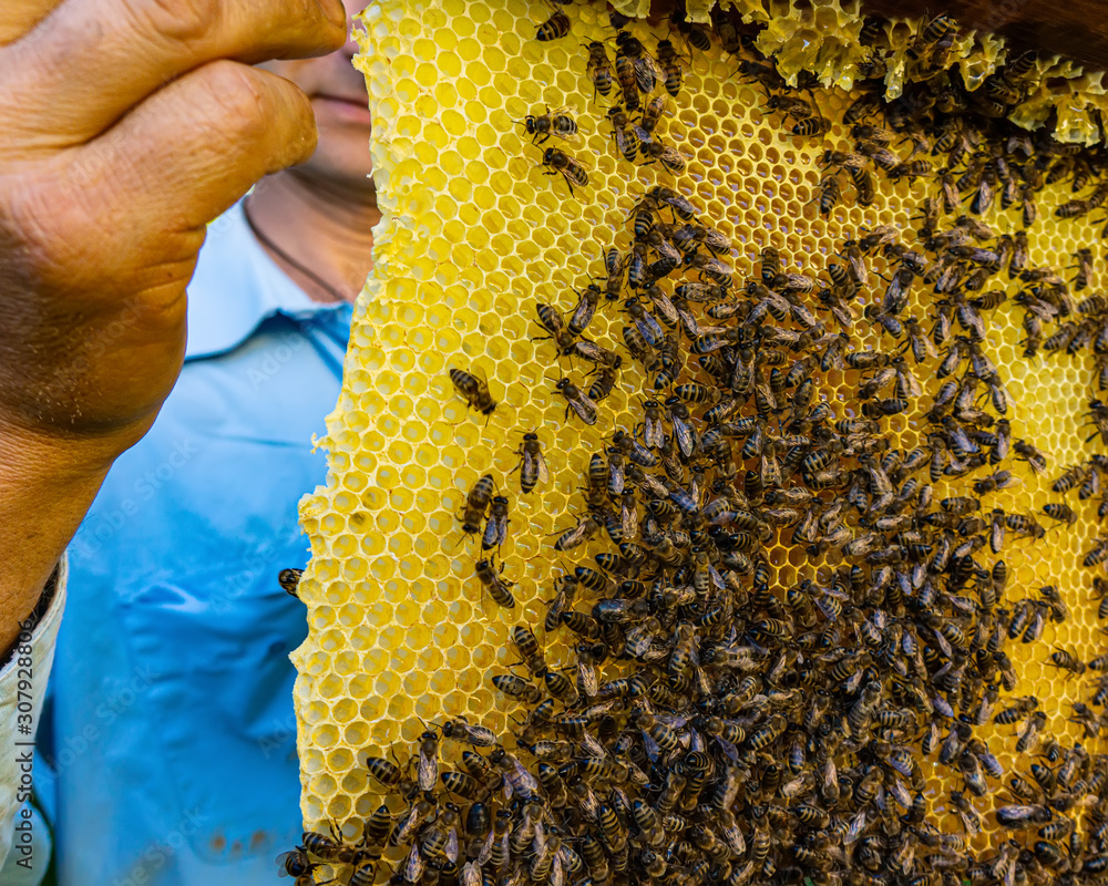beekeeper’s hands hold a natural wax honeycomb with bees during the inspection of the hive.