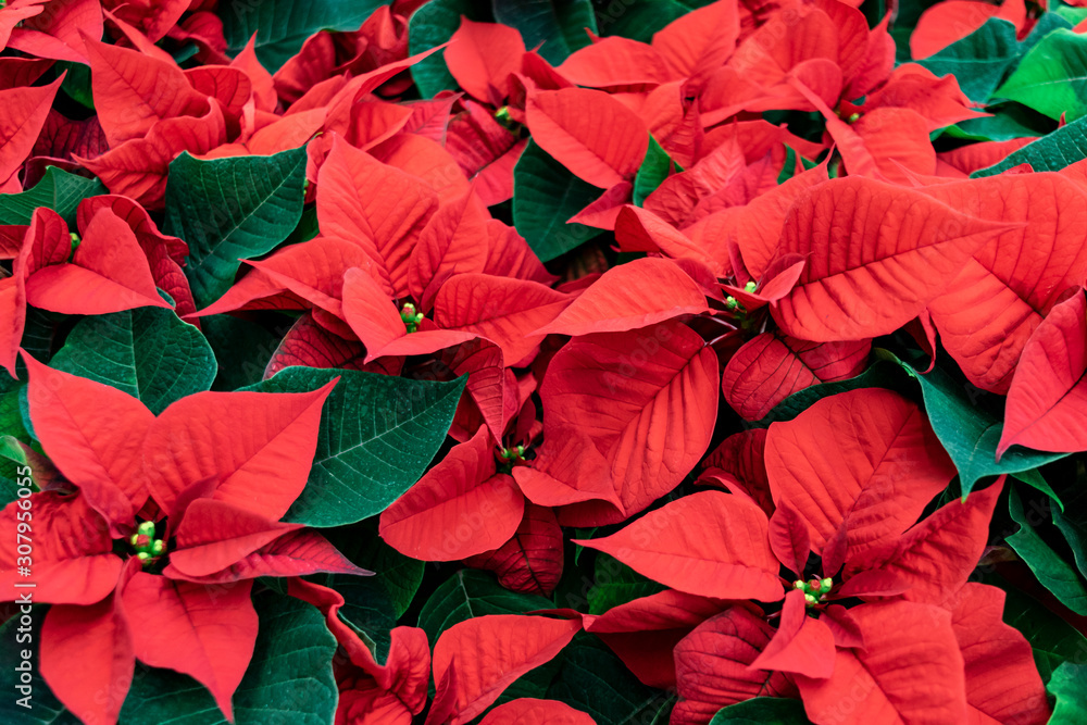 Red poinsettia Christmas background. Flowers Christmas star close-up. Traditional Xmas winter festive flowers.