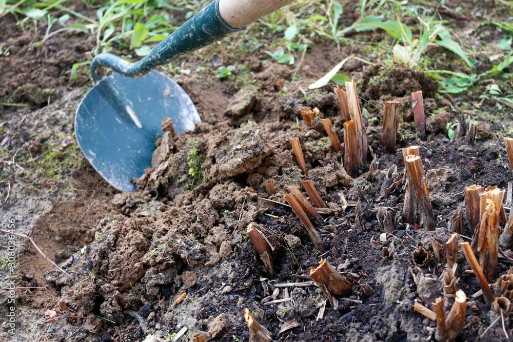 The gardener shows how to hoe a cluster of peonies to protect plants from cold in the winter season.