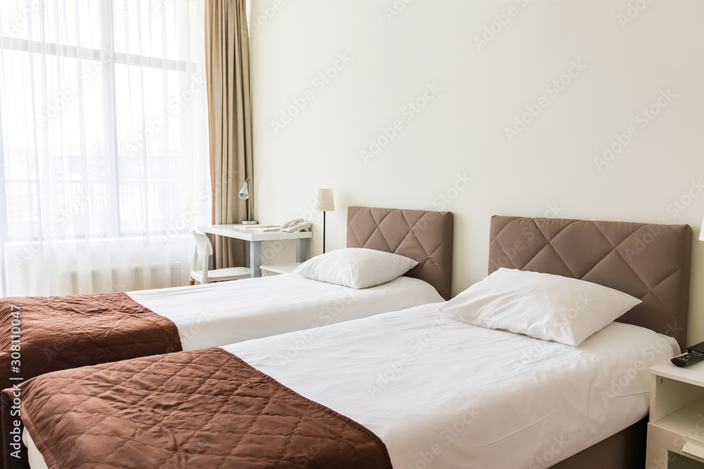 European light bedroom interior with brown, beige cozy bed and white linen, and a white nightstand near it, copy space