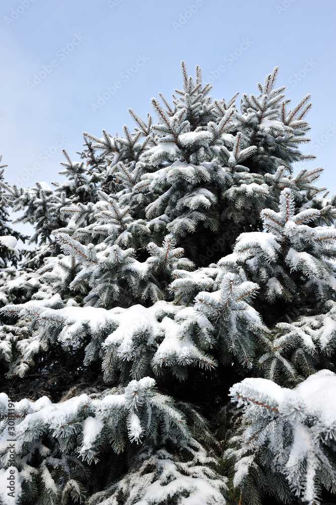 Blue spruce trees covered in snow. Winter season, january.