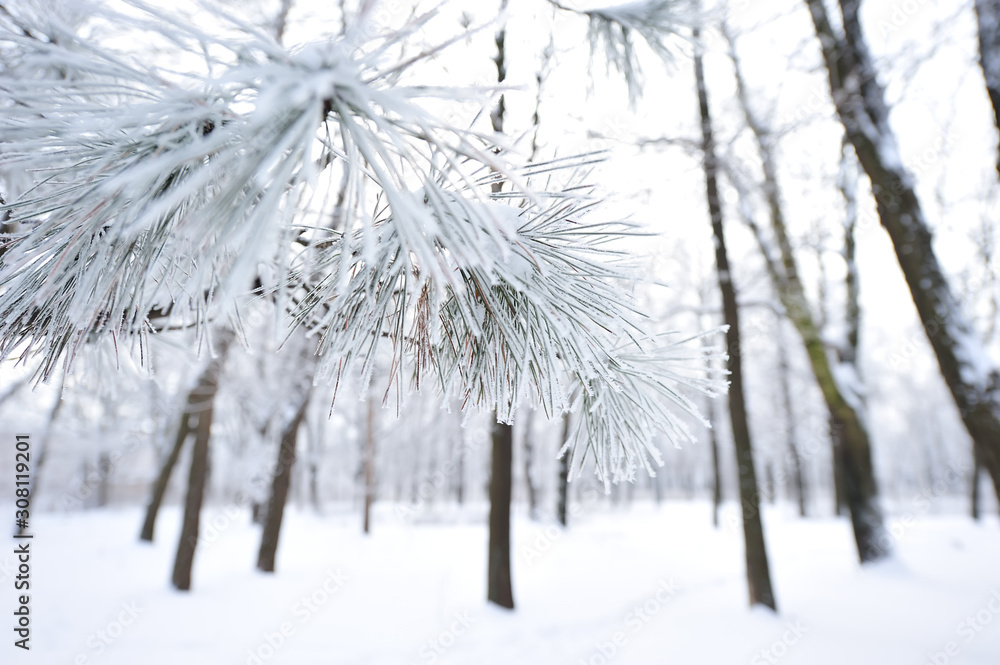 Trees and branches covered with snow and hoarfrost in a city park in the morning in cloudy weather.