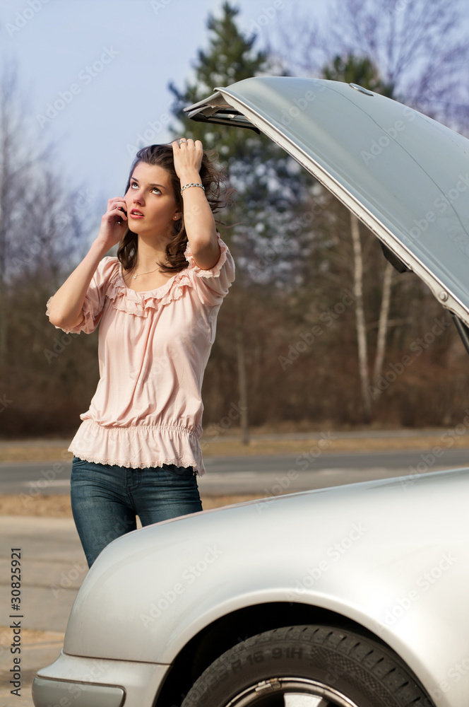 genervte Frau telefoniert nach Autopanne