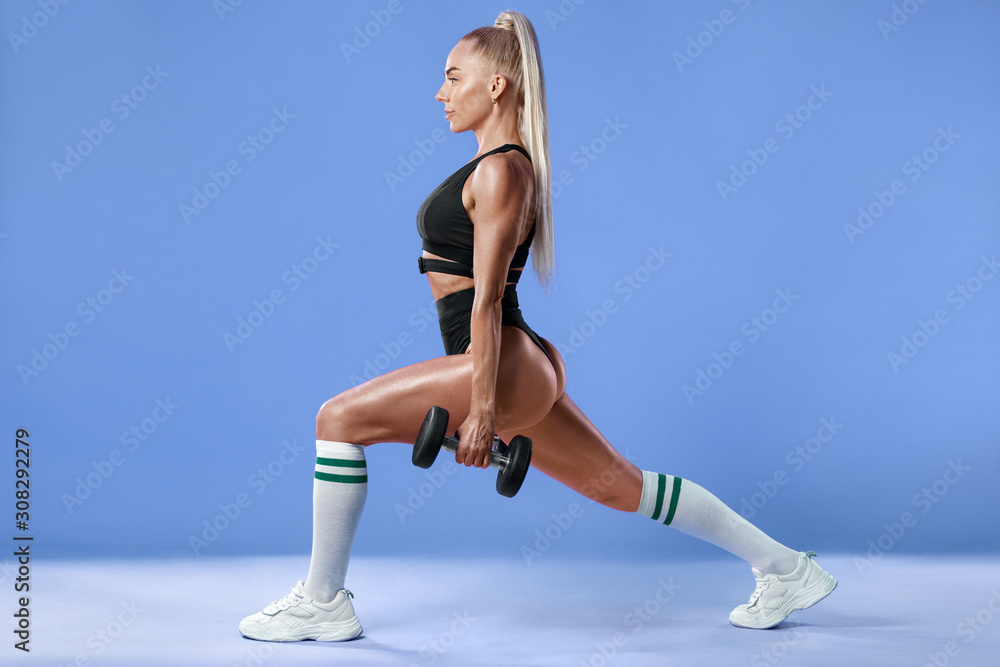 Fitness woman doing lunges exercises for leg muscle workout training. Active girl doing front forward one leg step lunge exercise, on the blue background