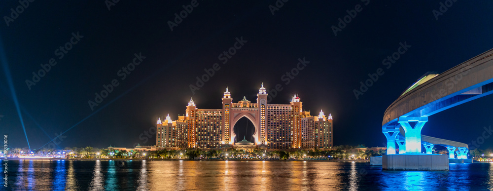 Night view of the Luxurious Atlantis Hotel in Palm Jumeirah taken at the blue hour, Dubai UAE
