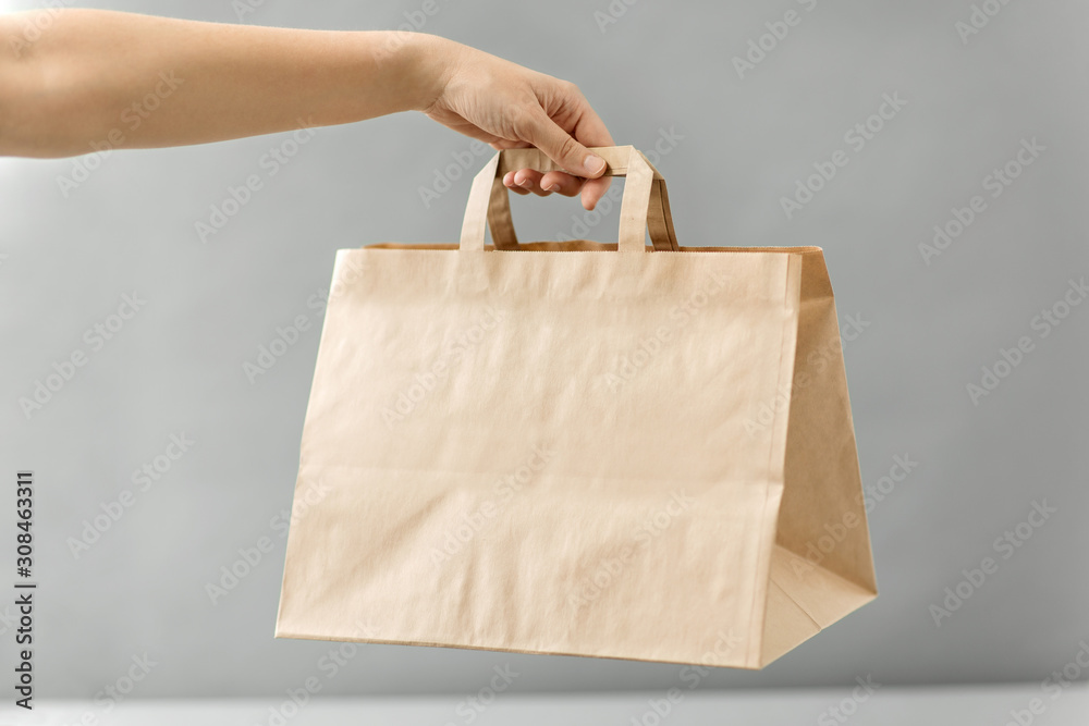 recycling, shopping and ecology concept - hand holding disposable brown takeaway food in paper bag with lunch on table