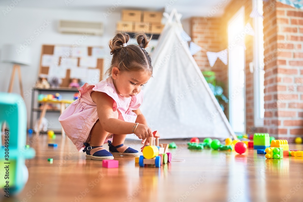 Young beautiful toddler sitting on the floor playing with wooden train toy at kindergaten