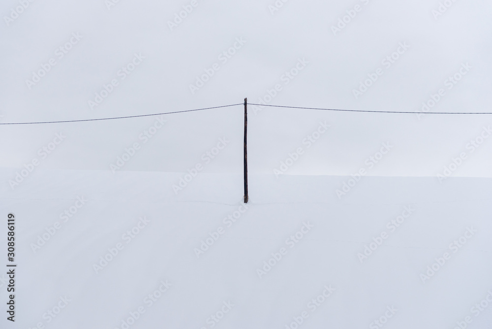 A telegraph pole standing alone on a completely snowy hill. Symmetrical composition, where the pole divides the frame in half. There is a wire hanging above. All in white background.