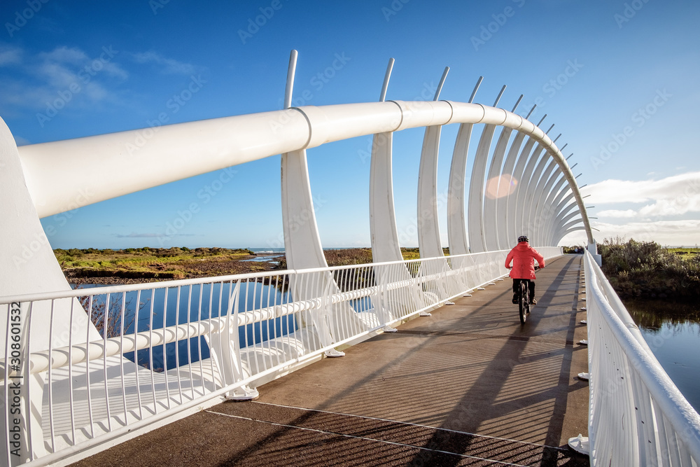 Leisure activity exercise image of a man biking across a bridge. With beautiful lens flare effect.