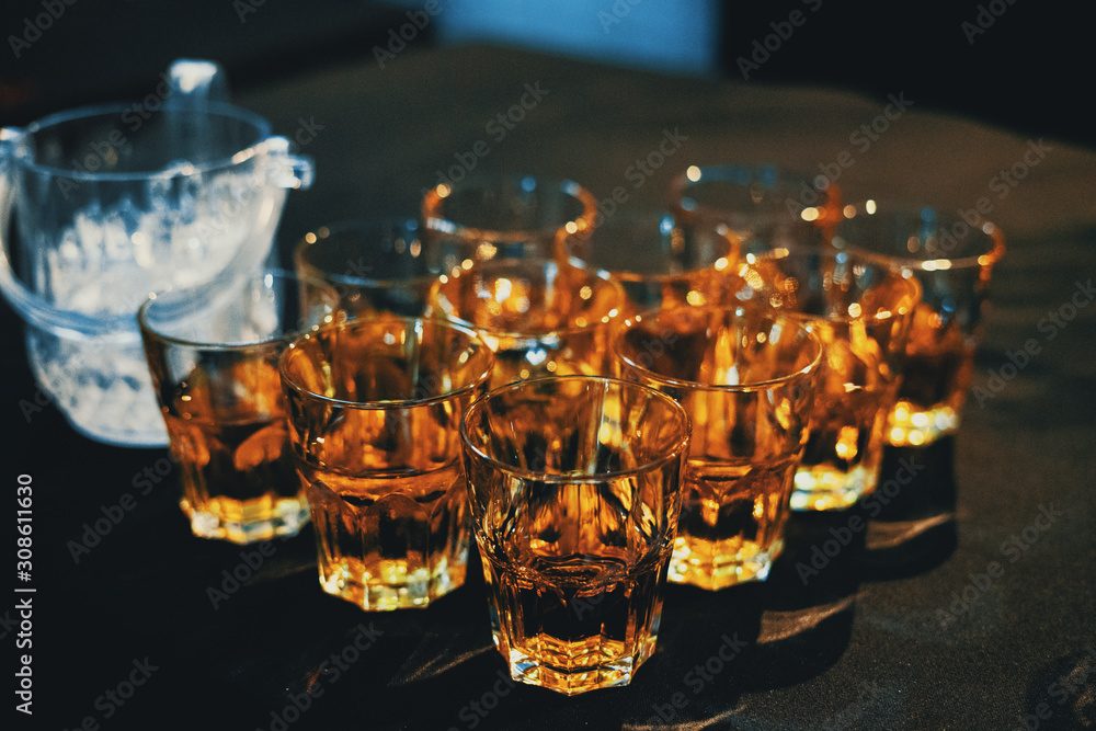 Classic alcohol beverage. Whiskey on old-fashioned glasses on dark background