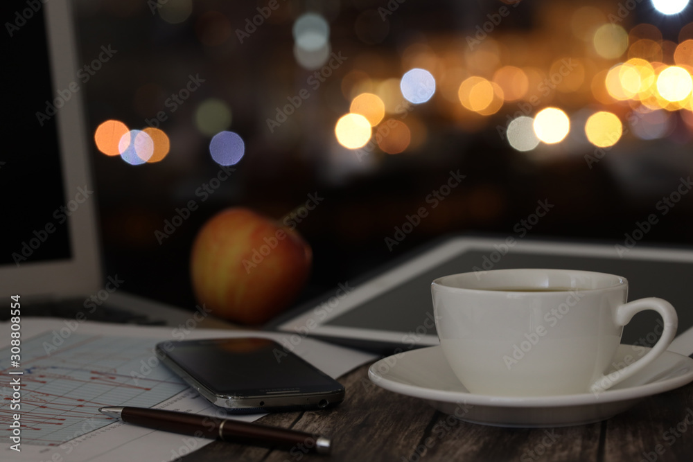 overtime in the evening, work from home, a cup of coffee and a laptop on a night background with beautiful bokeh