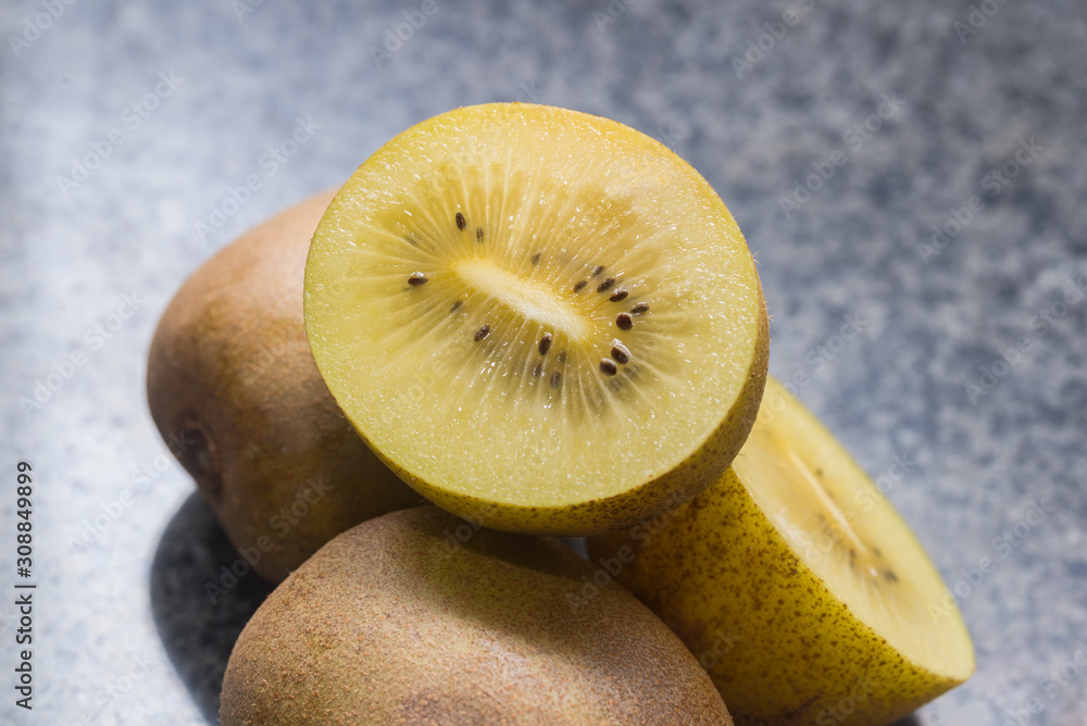 Some kiwis are on a marble table