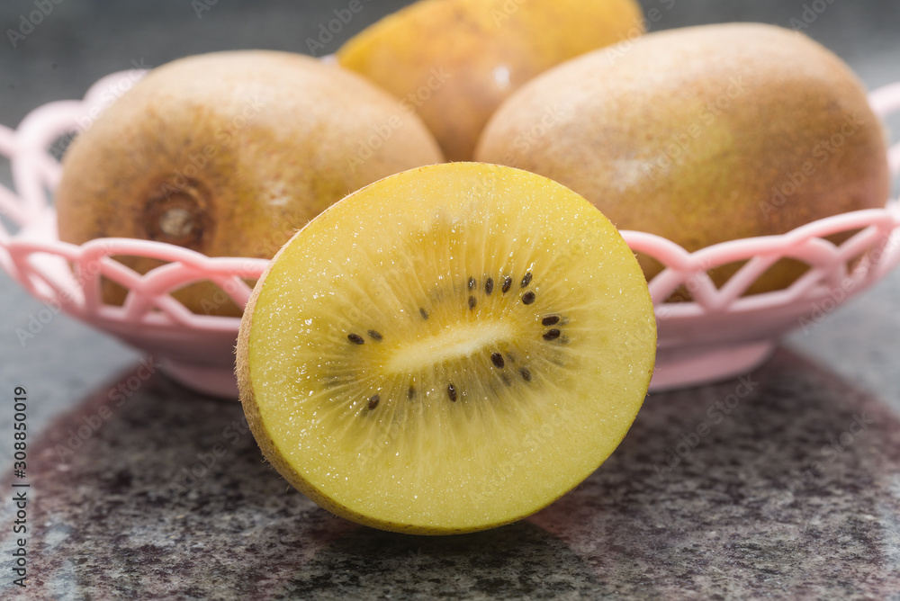 Some kiwis are served in a pink fruit basket