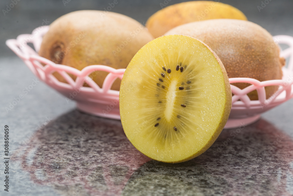 Some kiwis are served in a pink fruit basket