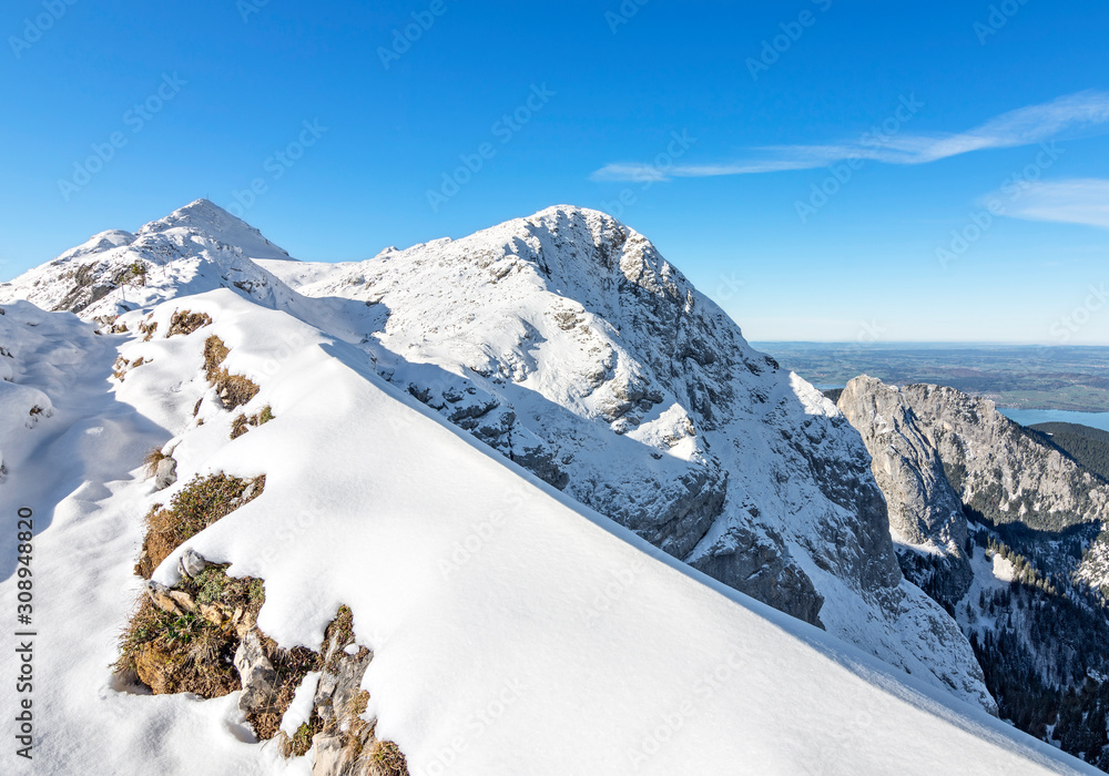 View to the summit of a snow-covered mountain in the Ammergau Alps. Bavaria, Germany