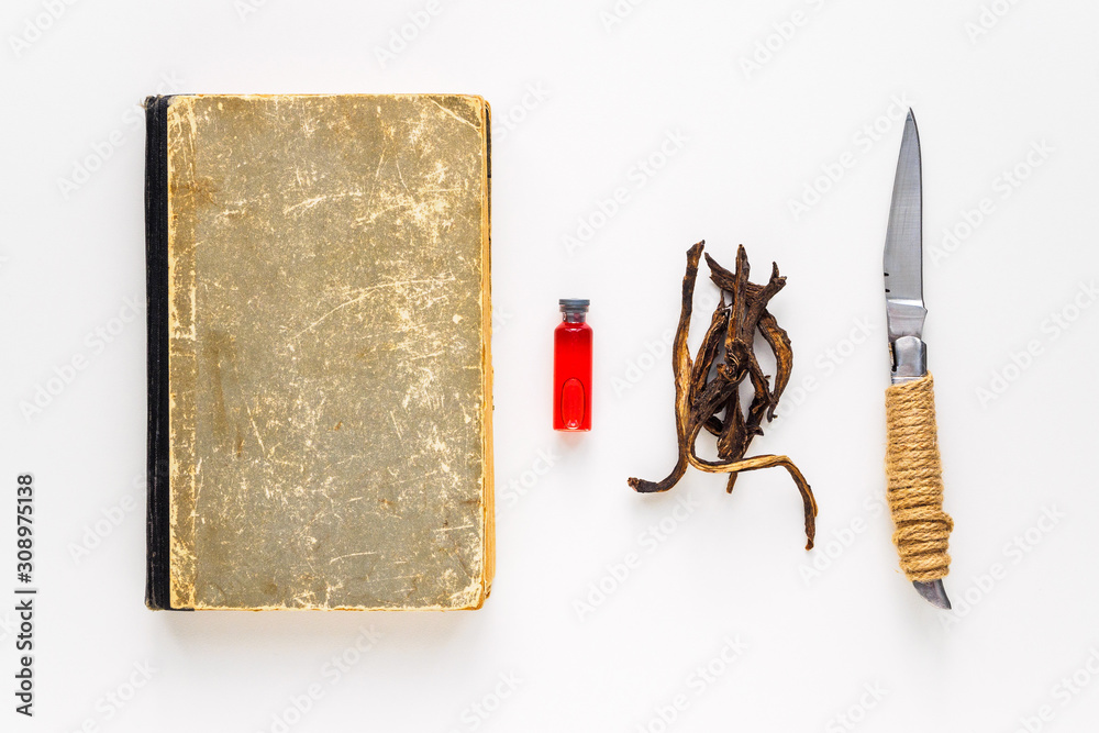 An old book, roots and an ampoule of blood. Attributes for magic, divination and occultism