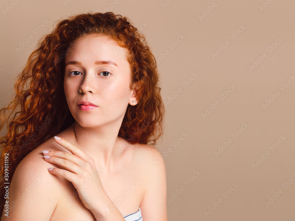 natural beauty of a young scandinavian girl. Portrait of a beautiful woman without makeup. Shot in a studio on a beige background. Copy space for text