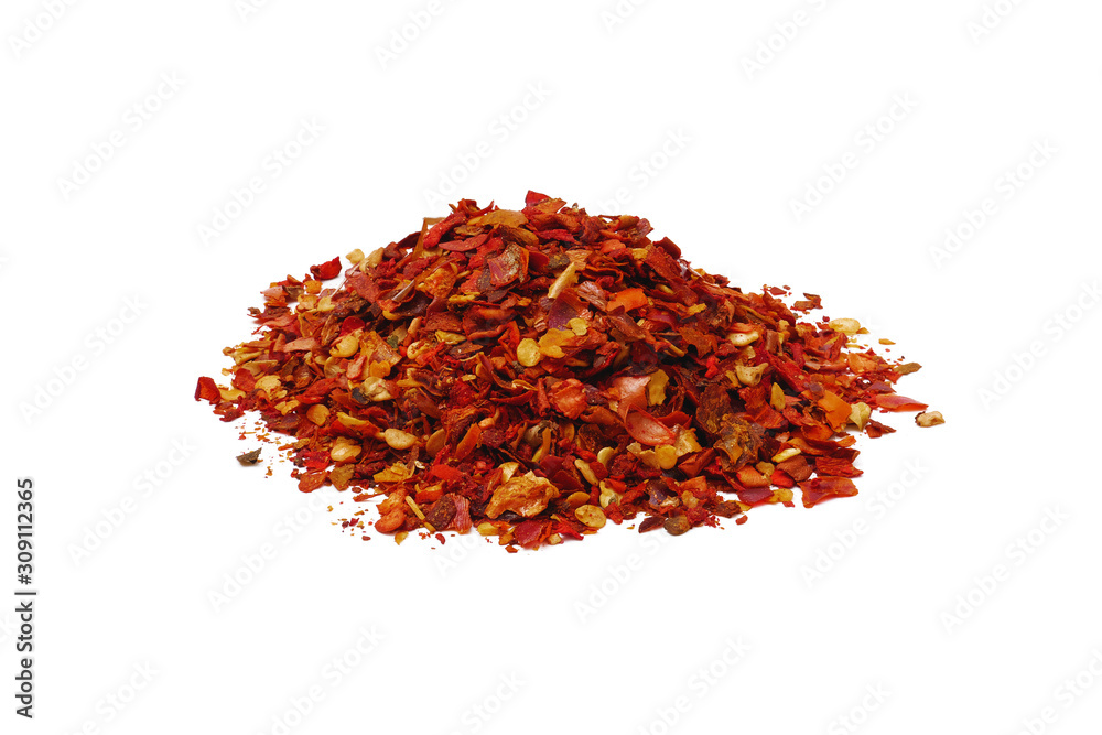 heap of ground dried chili pepper flakes isolated on white background, full depth of field