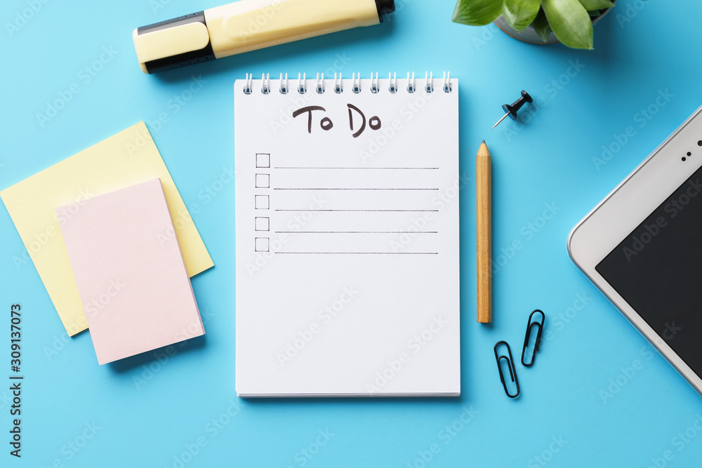 A notebook with to-do list on a blue desk with stationery.