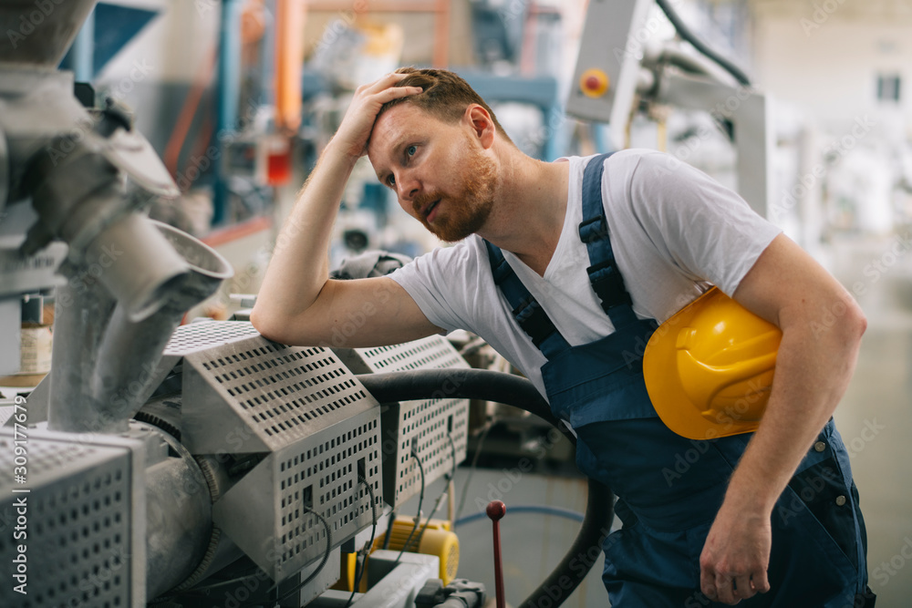 Tired factory worker. Man with helmet working.