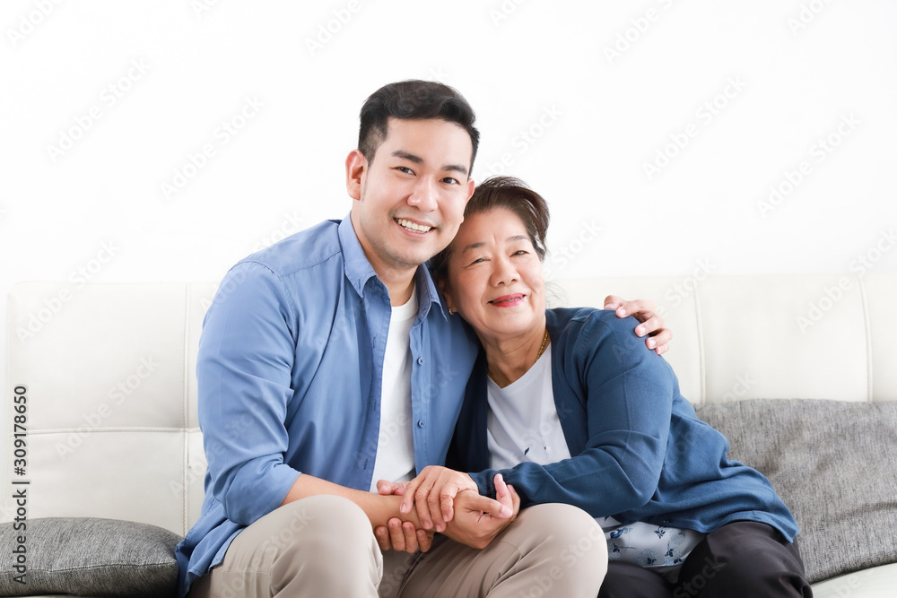 Asian young man and senior woman using laptop computer in living room concept Son teach mother use computer laptop