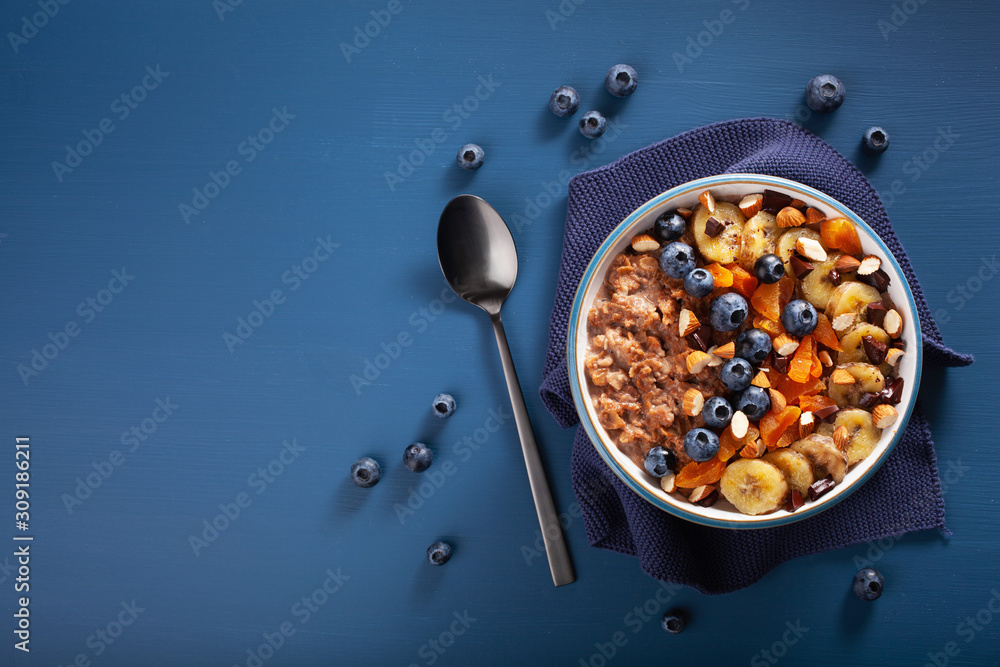 chocolate oatmeal porridge with blueberry, nuts, banana, dried apricot for healthy breakfast. Top view