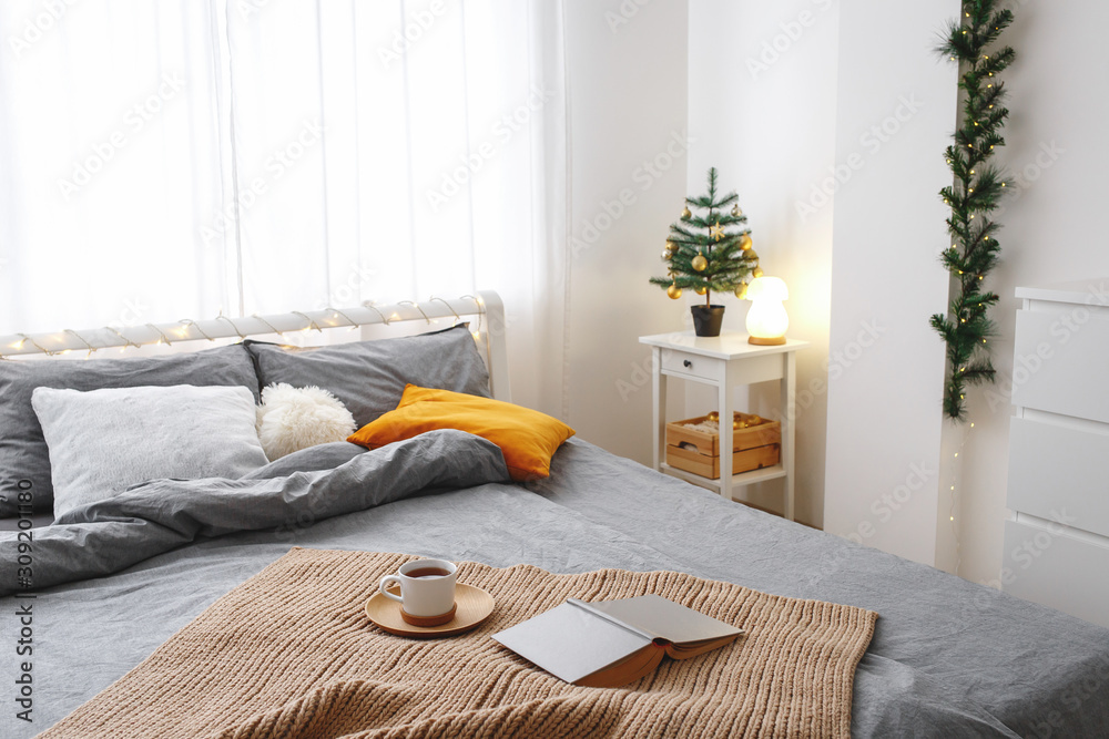 Christmas cozy winter home scene. New year interior decorations. Stylish cosy bedroom decor. Christmas tree on bedside table and bed with grey linen, blanket, pillows, knitted plaid, cup of tea, book.