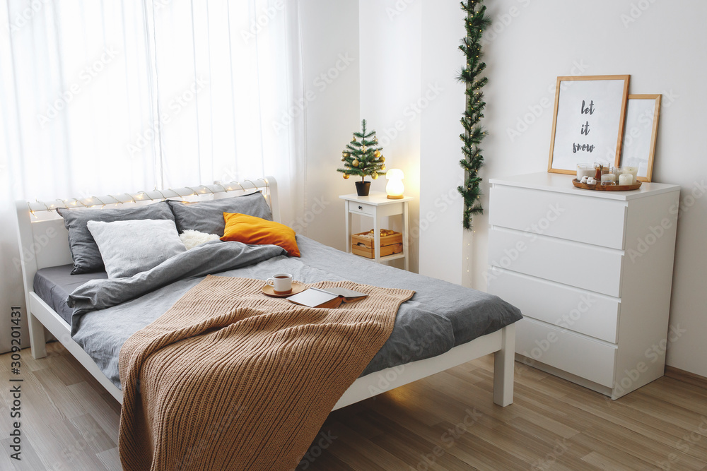 Christmas cozy winter home decor. New year interior decorations. Stylish cosy bedroom. Christmas tree on bedside table, chest of drawers and bed with grey linen, blanket, pillows, knitted plaid.