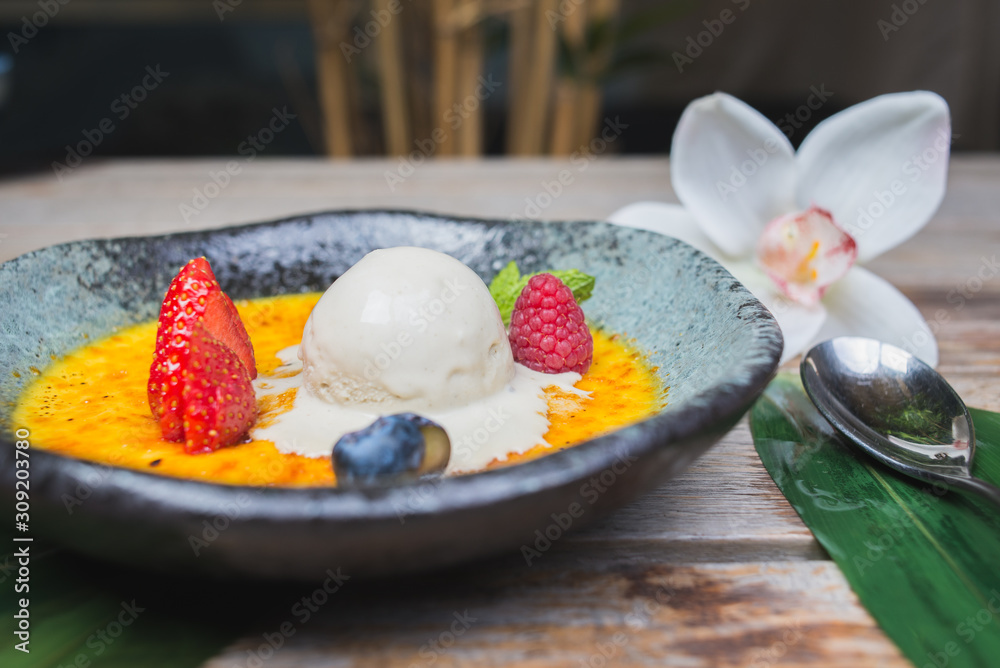 Traditional dessert cream catalana and creme brulee in a beautiful plate on a wooden table in a restaurant or cafe.