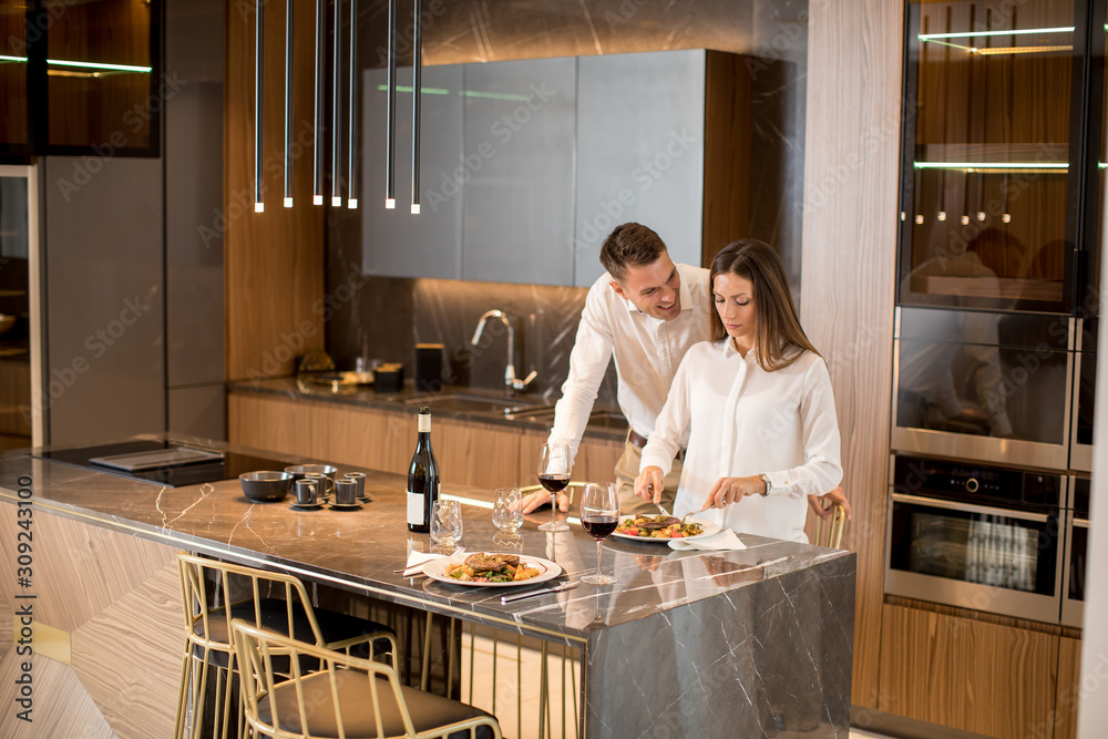 Sweet couple having a romantic dinner at luxury kitchen