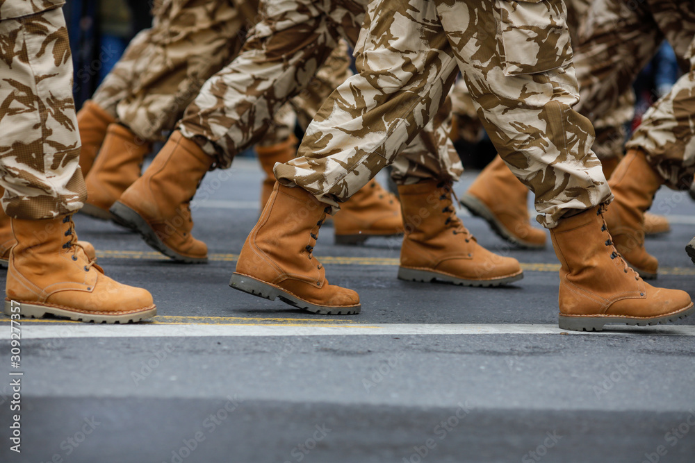 Romanian army soldiers marching during the Romanian National Day military parade.