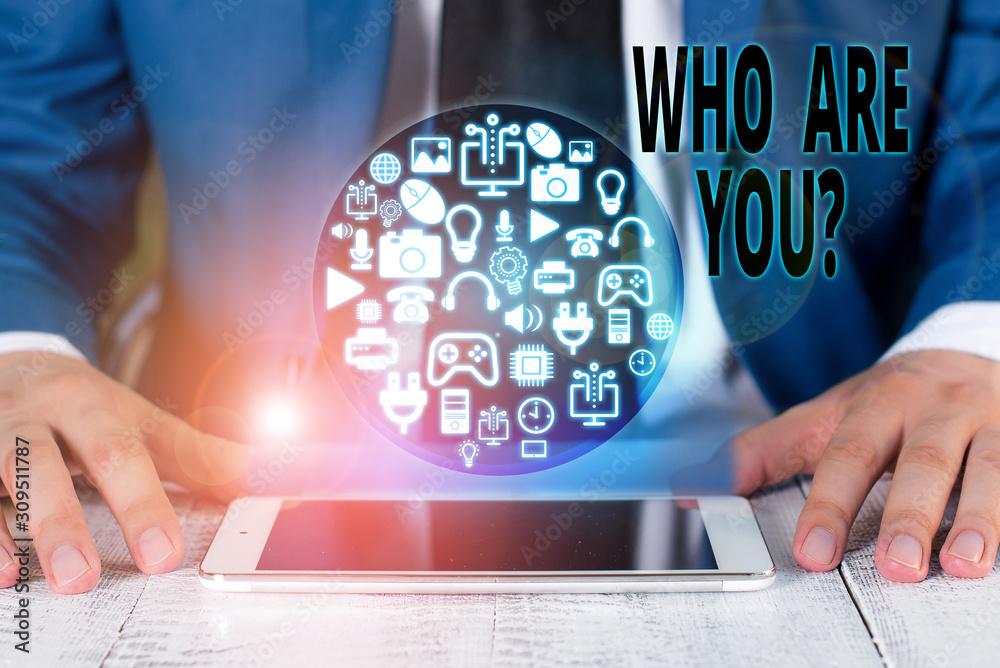 Conceptual hand writing showing Who Are You Question. Concept meaning asking about someone identity or demonstratingal information