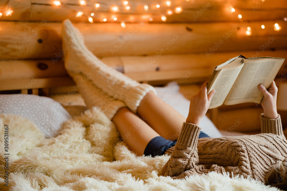 Adult woman relaxing on cozy bed in log cabin in cold winter.
