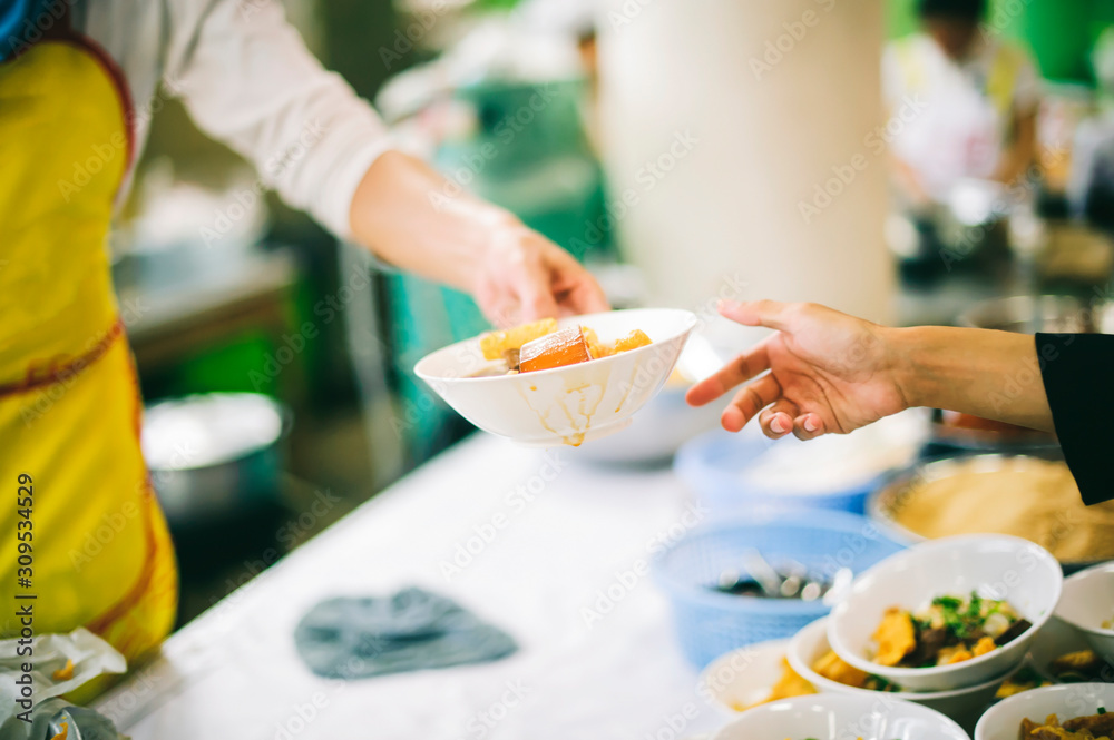 The hands of the poor receive food that volunteers share to alleviate hunger: the concept of donating food to the poor