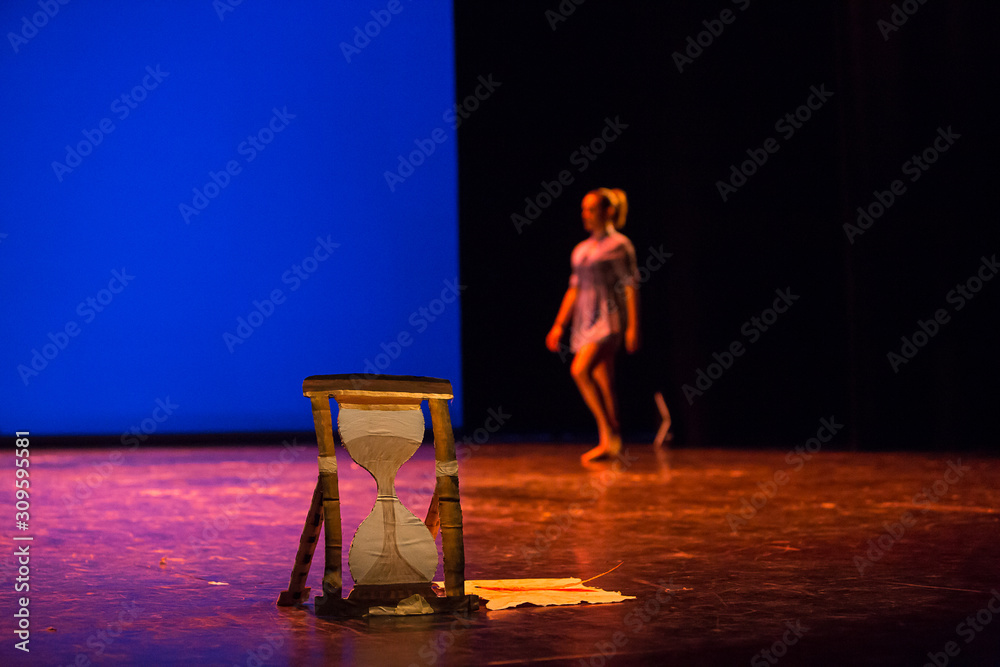 Cardboard hourglass on a theater stage with a blurred figure of a woman in the background