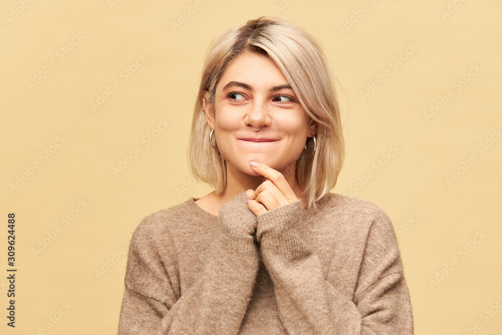 Beautiful mysterious European girl in stylish cozy sweater having amazed enigmatic facial expression, looking away and smiling, coming up with idea, thinking about plan isolated at blank studio wall