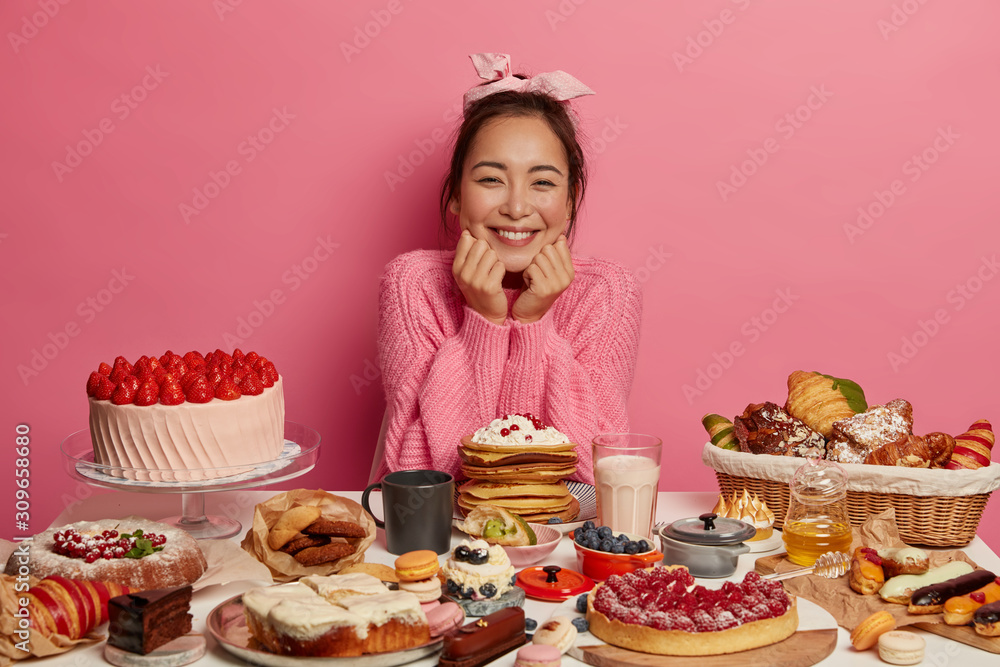Feminine girl smiles pleasantly, keeps both hands under chin, dressed in knitted rosy sweater, poses at table with sugary desserts and bakery, thinks what to eat first, isolated over pink background