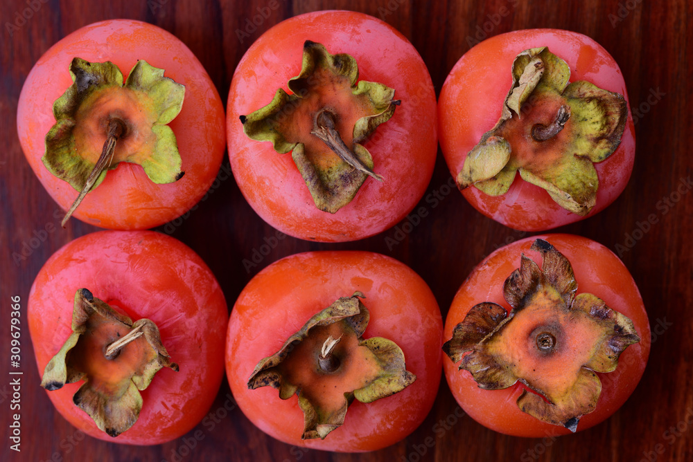 6 overripe orange persimmon fruits lie next to each other on dark wood